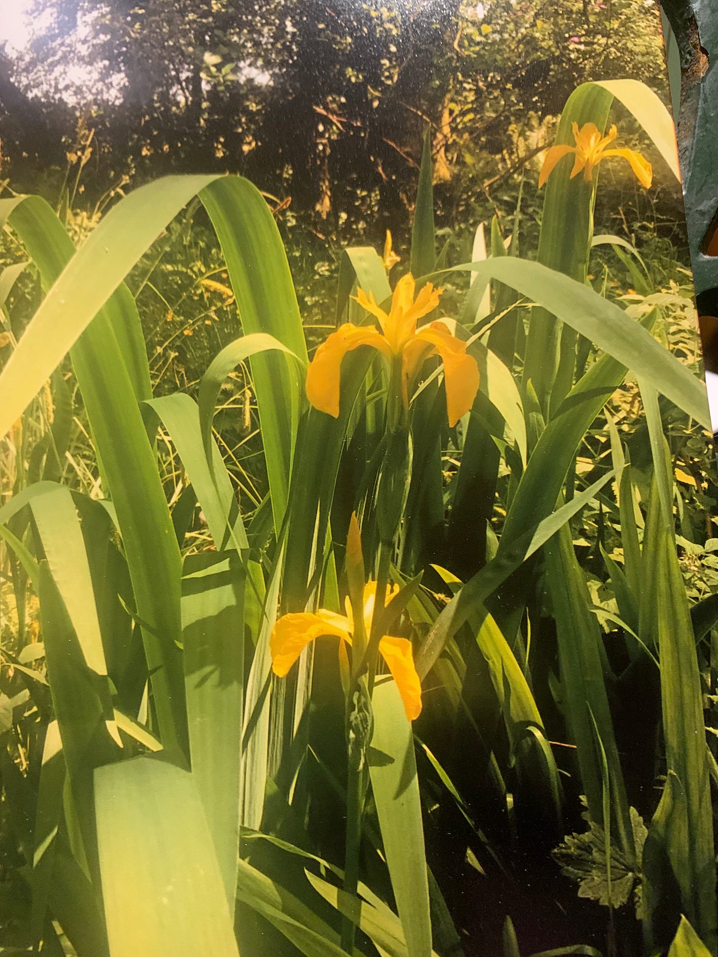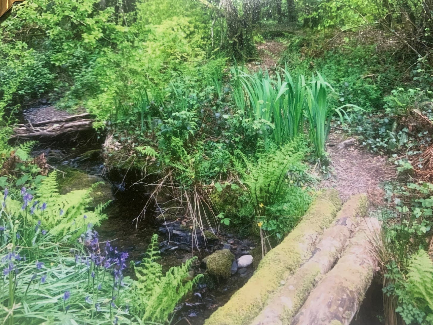 Yesterday I dragged a few handfuls of waterweed out, so the water has fallen clear, with more room for the one golden fish that has grown larger each year, hiding from the heron in the silty depths. I venture further, still in pyjamas and dressing gown, and my old green cut- off wellies, inherited from whoever had left them here in the house when I moved in, nearly 9 years ago now. I walk along to the stream, pleased to notice the red campions I bought and so carefully protected with wigwams of sticks a couple of years ago, growing and flowering and obviously happy here in the woodland shadows, the dusky pink of their petals looking so well amongst the bluebells. And then without thinking about where I am going, or why, I carefully edge across the bridge constructed of three mossy logs placed from bank to bank, avoiding stepping on the clump of bluebells which have madly decided to grow on the soft brown hummus of the path; and notice a large patch of flag iris growing now under the tall beech trees, having seeded themselves on the bank of the stream.